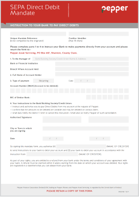 A Direct Debit mandate provides Pepper Advantage with written permission to receive payments from your Bank Account.